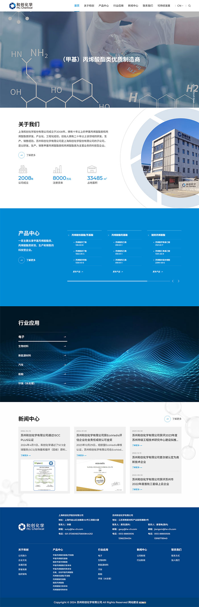 上海和創化學股份有限公司成立于2008年,擁有十年以上的甲基丙烯酸酯類和丙烯酸酯類研發、產業化、工程化經驗,創始人擁有二十年以上該領域的研發、生產、銷售經驗。蘇州和創化學有限公司是上海和創化學股份有限公司的子公司,是以研發、生產、銷售甲基丙烯酸酯類和丙烯酸酯類為主營業務的科技型企業。